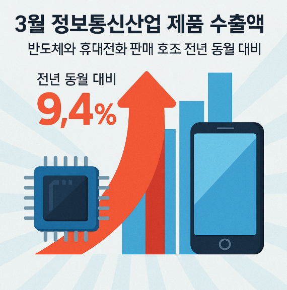 3월 정보통신산업 제품 수출액이 반도체와 휴대전화 판매 호조로 전년 동월 대비 9.4% 증가한 것으로 나타났다. 이는 글로벌 시장의 수요 회복과 주요 제품의 경쟁력 향상이 결합된 결과로 분석된다. 특히 반도체와 휴대전화를 중심으로 한 정보통신기술(ICT) 제품의 수출이 크게 늘면서 전체 수출 증가를 이끈 것으로 보인다.