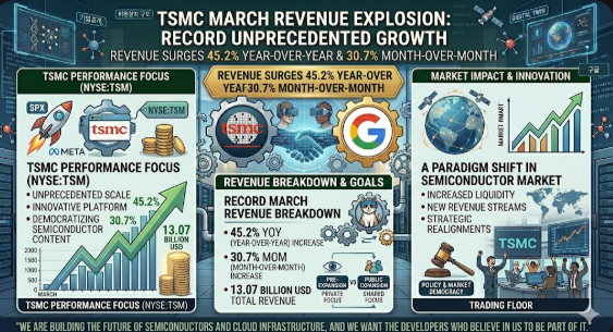 세계 최대 파운드리 기업 TSMC 가 발표한 3월 매출은 글로벌 반도체 시장의 흐름을 단적으로 보여주는 중요한 지표로 평가된다. 3월 매출은 전년 대비 45점2퍼센트 급증한 130억7000만 달러를 기록했으며 전월인 2월과 비교해도 30점7퍼센트 증가하는 강한 성장세를 나타냈다. 이는 단순한 계절적 반등이 아니라 구조적인 수요 증가가 반영된 결과로 해석된다.